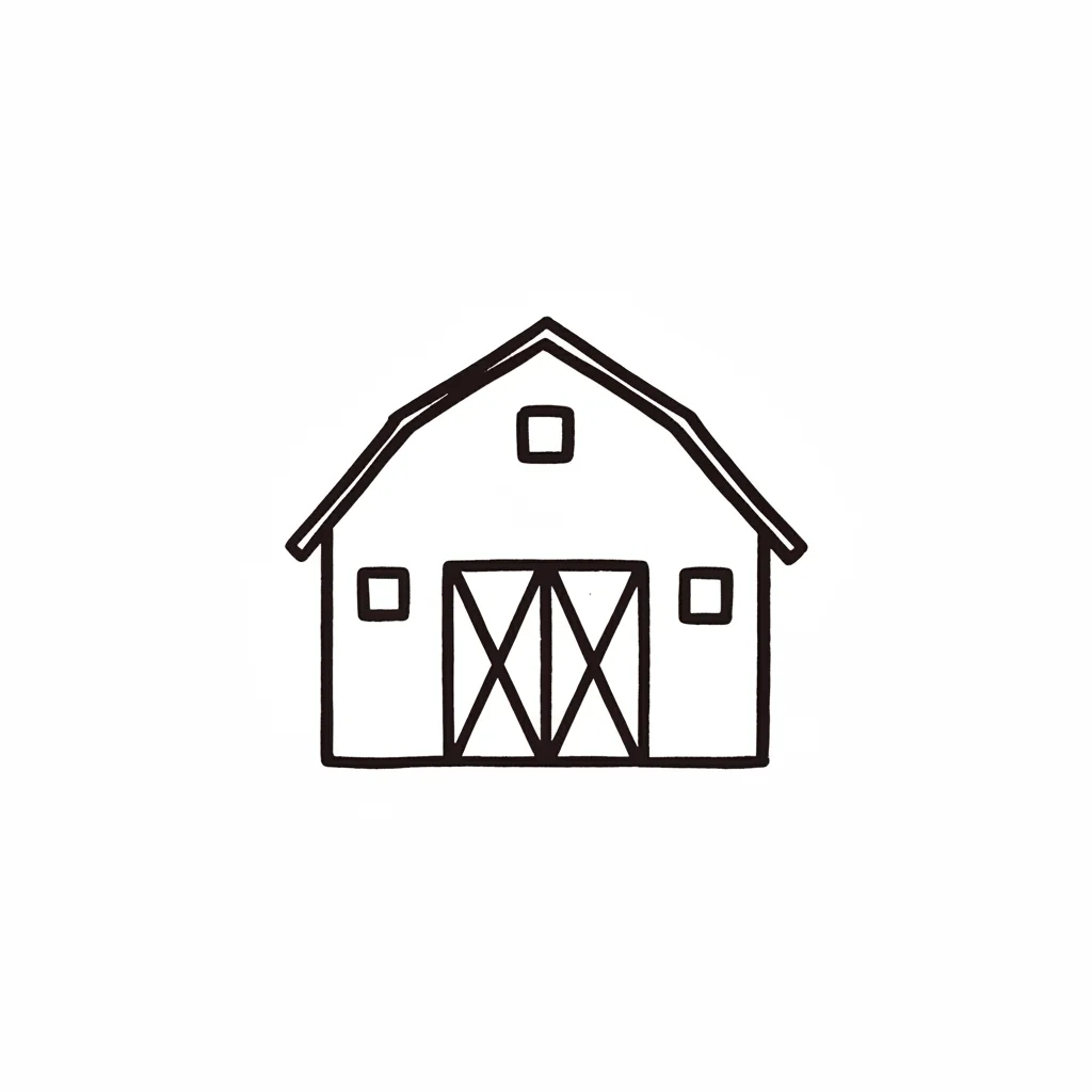 Einfache Strichzeichnung einer Scheune mit Giebeldach, Doppeltüren und kleinen Fenstern.