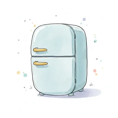 Ein einfacher, gezeichneter Kühlschrank mit zwei Türen und einem grünen Licht.