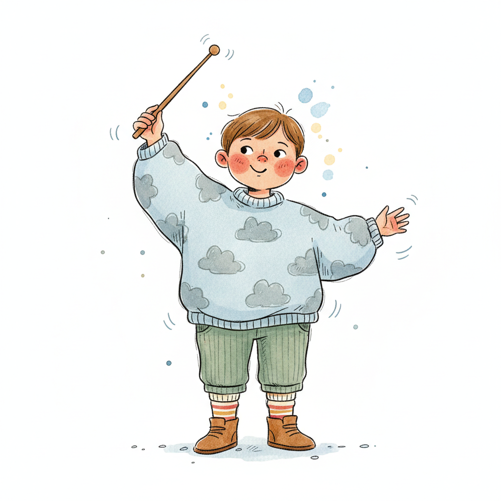 Junge in einem Wolkenpullover, der mit einem Stock spielt und fröhlich aussieht.