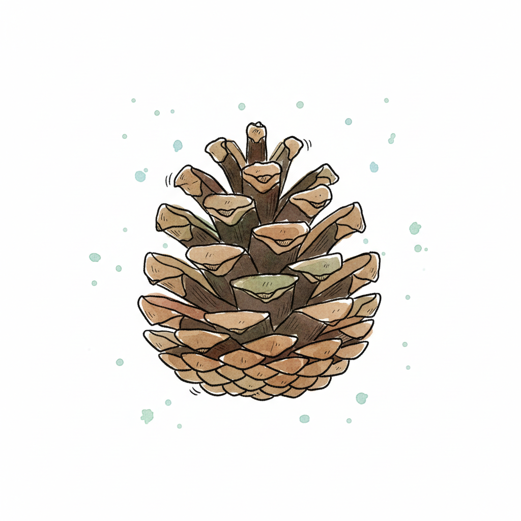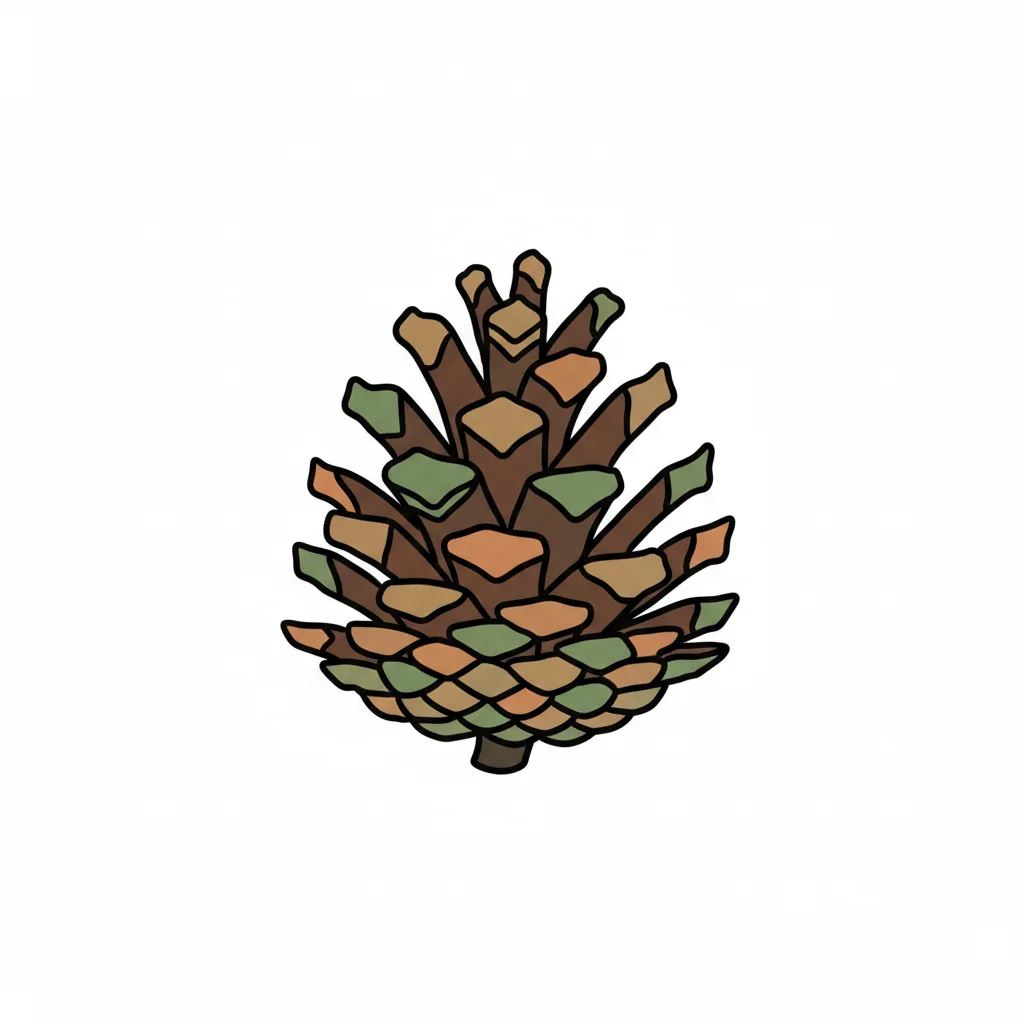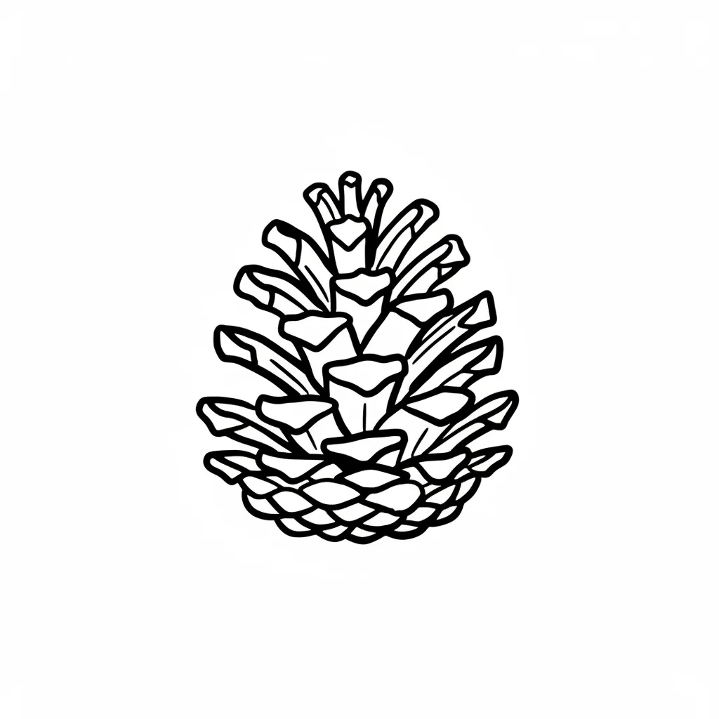 Stilisierte braune Tannenzapfen-Illustration mit schwarzen Umrissen auf weißem Hintergrund.
