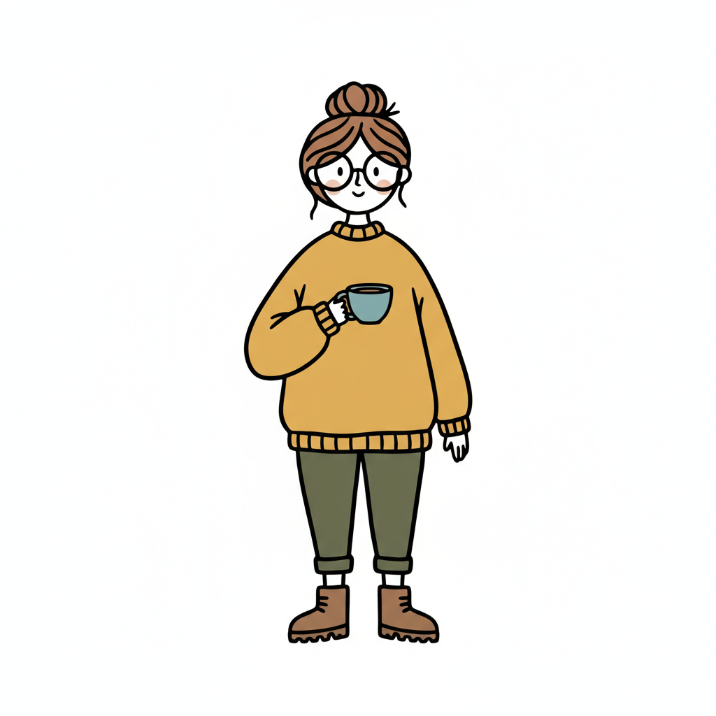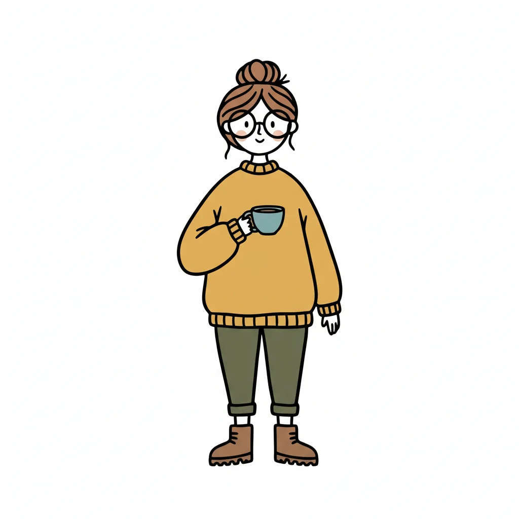 Eine figurative Darstellung eines Mädchens mit einer Tasse in einem gemütlichen Outfit.