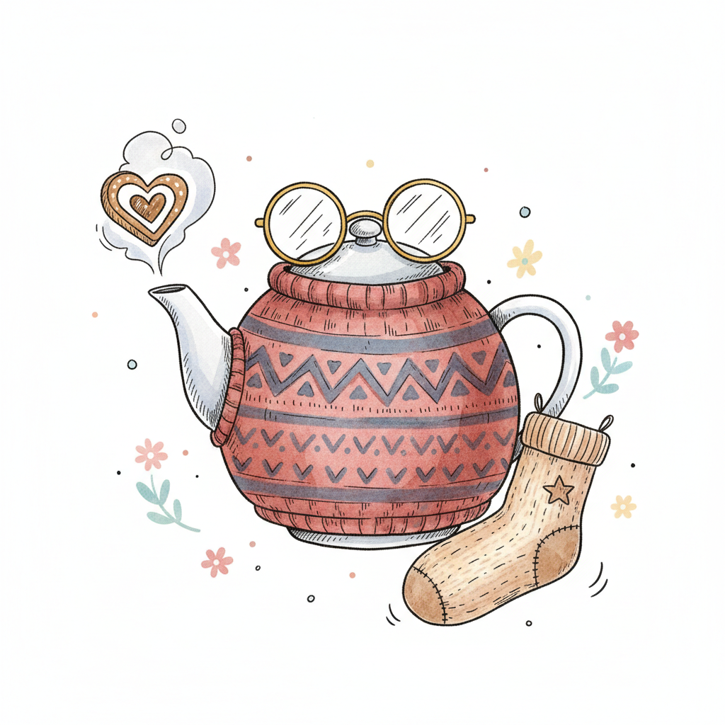 Ein Teekessel mit Brille, umhüllt von einem gemusterten Pullover und einer Socke.