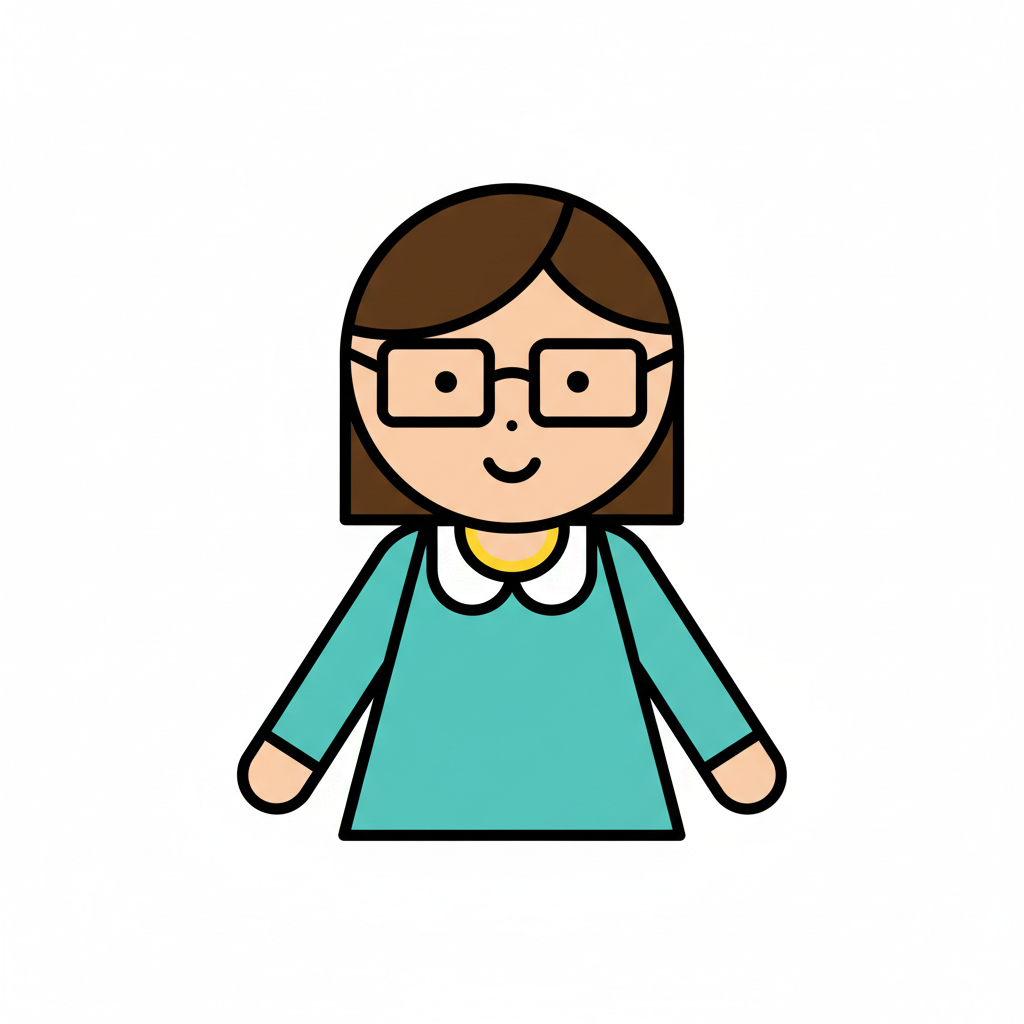 Eine cartoonhafte Frau mit Brille und blauer Kleidung.