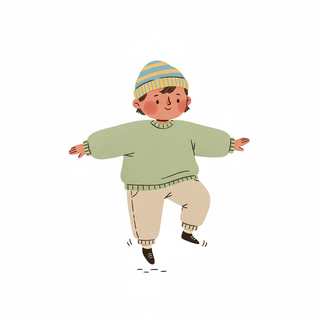 Handgezeichnete Kinderbuchillustration im modernen skandinavisch-nordischen Stil. Minimalistische, freundliche Figur mit einfachen Formen und leicht unregelmäßigen, handgezeichneten Linien. Ruhige, gedeckte Farbpalette, viel freie Fläche, reduzierte Details, sanfte Papier- oder Aquarellstruktur. Warme, ruhige, leicht humorvolle Stimmung, flächige Komposition ohne starke Perspektive, moderner nordischer Illustrationsstil, charmant und zeitlos.