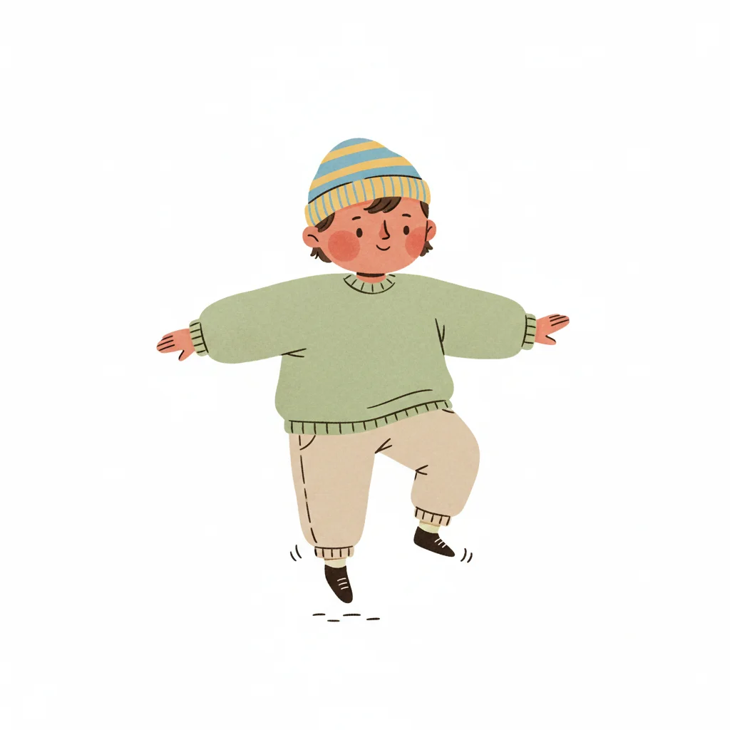 Ein fröhlicher Junge tanzt in einem übergroßen Pullover und gestreiften Leggings.