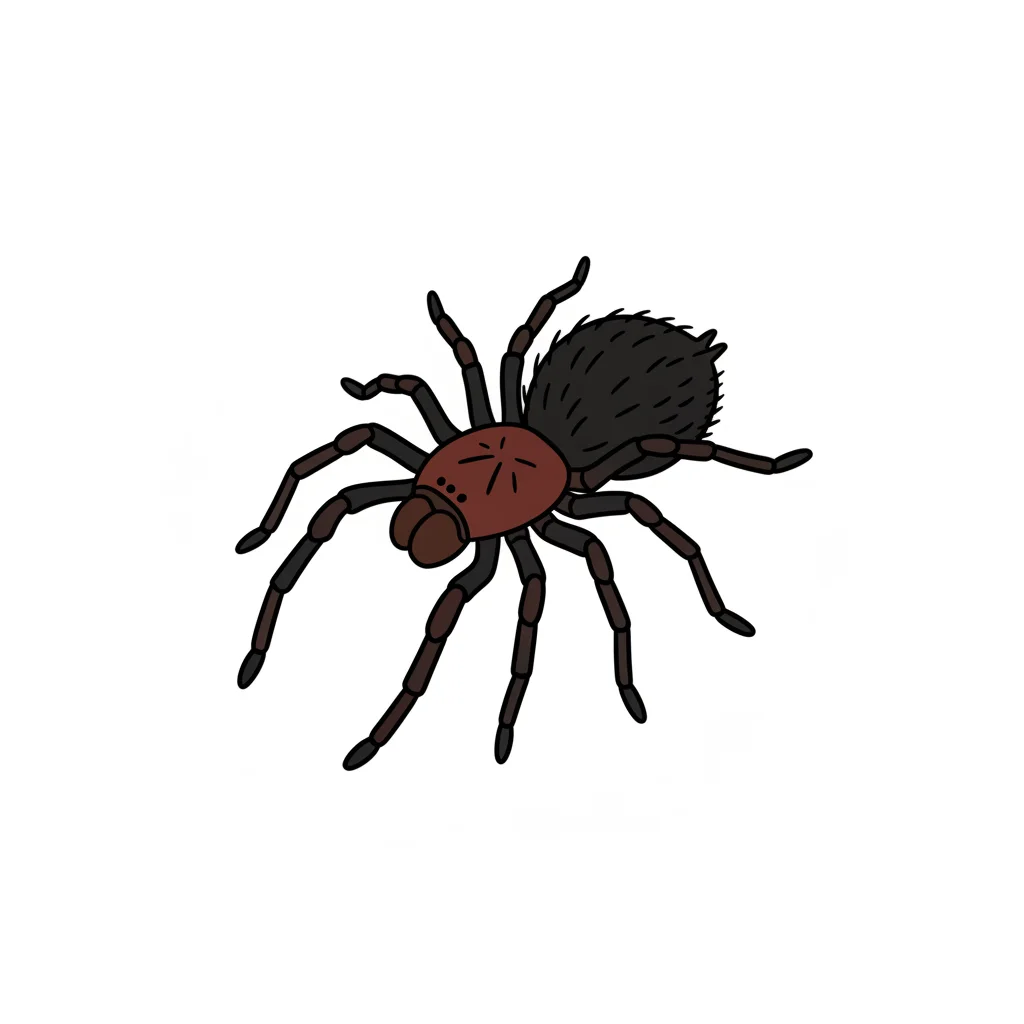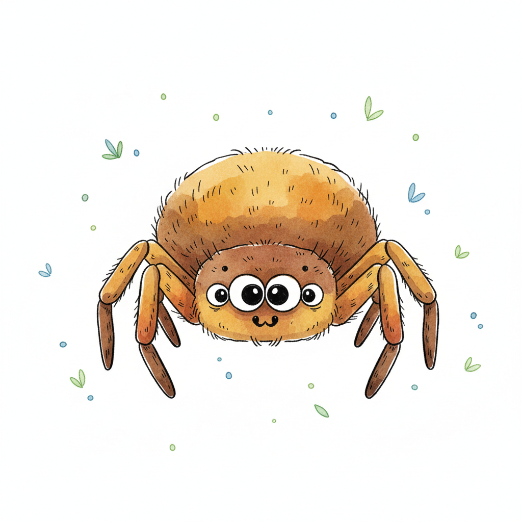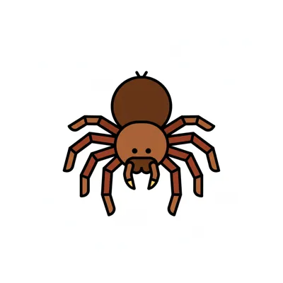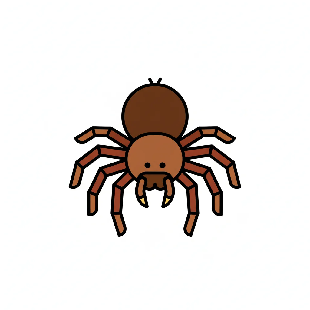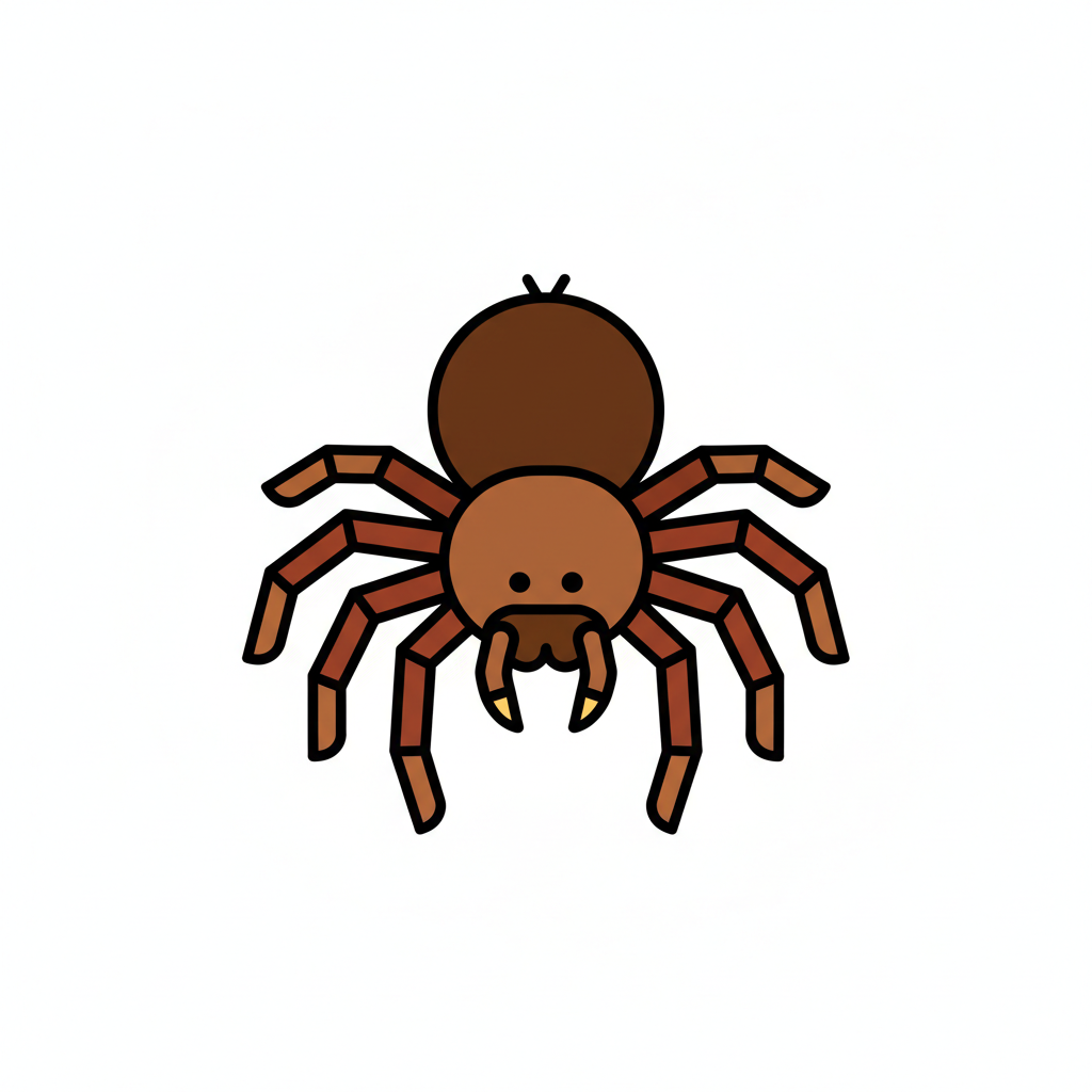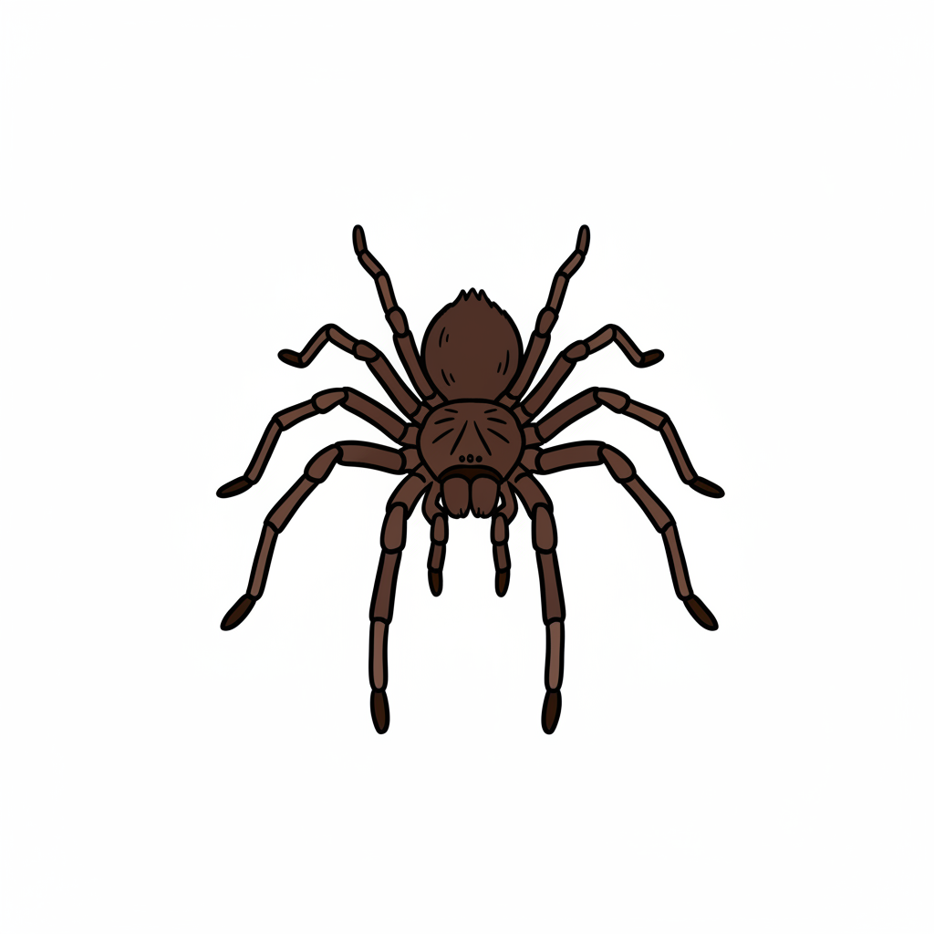 Eine cartoonhafte Darstellung einer braunen Spinne aus der Vogelspinnenfamilie.