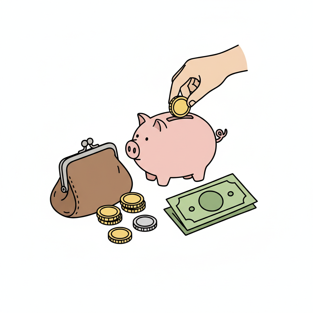 Hand steckt Münze in Sparschwein, daneben Geldbörse, Münzen und Scheine. Sparen.