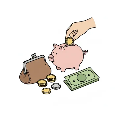 Eine Hand steckt eine Münze in ein Sparschwein, umgeben von Münzen und Geldscheinen.