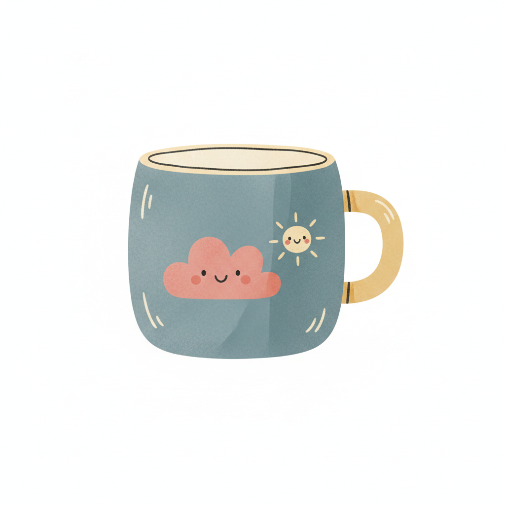 Süße Tasse mit lächelnder Wolke und Sonne.