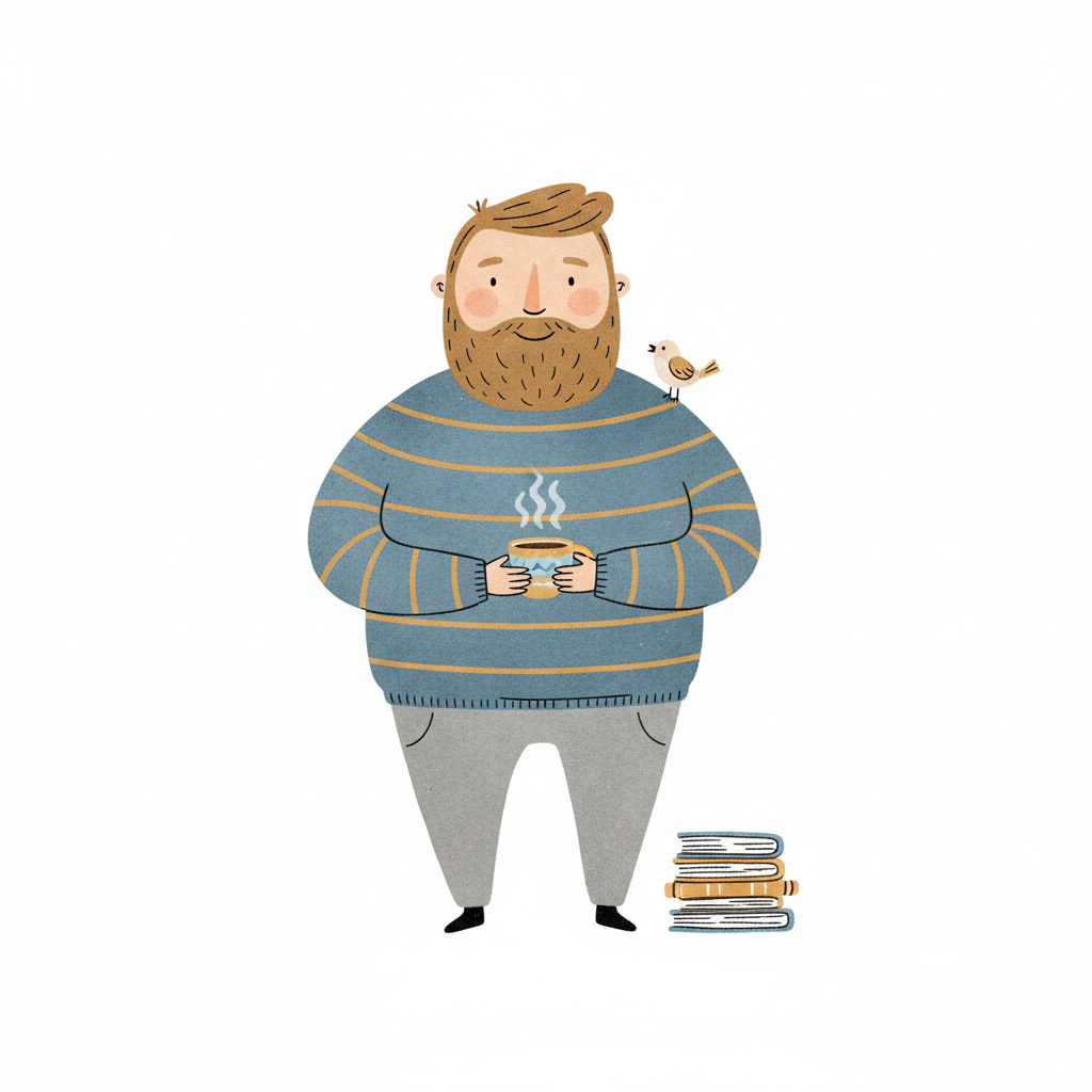 Handgezeichnete Kinderbuchillustration im modernen skandinavisch-nordischen Stil. Minimalistische, freundliche Figur mit einfachen Formen und leicht unregelmäßigen, handgezeichneten Linien. Ruhige, gedeckte Farbpalette, viel freie Fläche, reduzierte Details, sanfte Papier- oder Aquarellstruktur. Warme, ruhige, leicht humorvolle Stimmung, flächige Komposition ohne starke Perspektive, moderner nordischer Illustrationsstil, charmant und zeitlos.