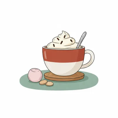Eine Tasse mit Sahne und Keksen auf einem Untersetzer.