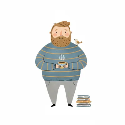 Mann mit Bart hält eine Tasse, neben ihm Bücher und ein Vogel.
