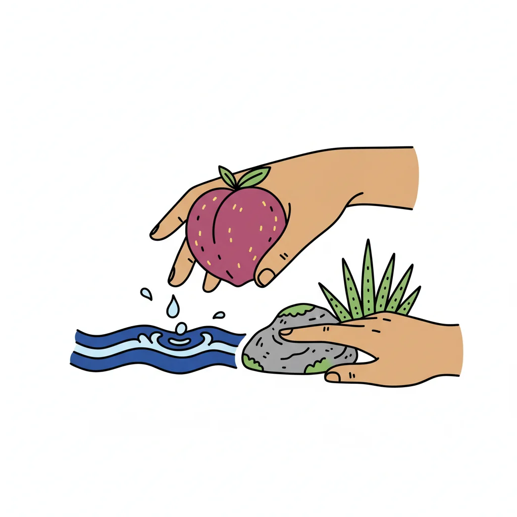 Zwei Hände interagieren mit Natur: Eine hält Frucht über Wasser, die andere berührt Stein mit Pflanze.