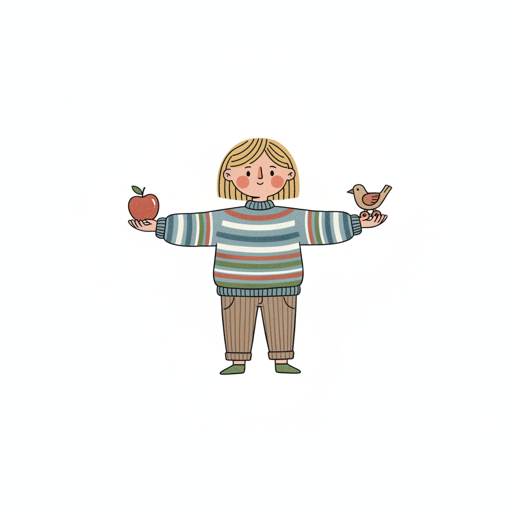 Niedliche Cartoon-Person hält Apfel und Vogel in den Händen, Arme ausgestreckt.