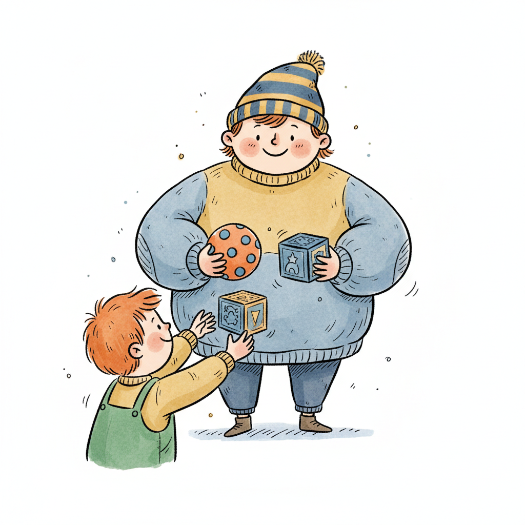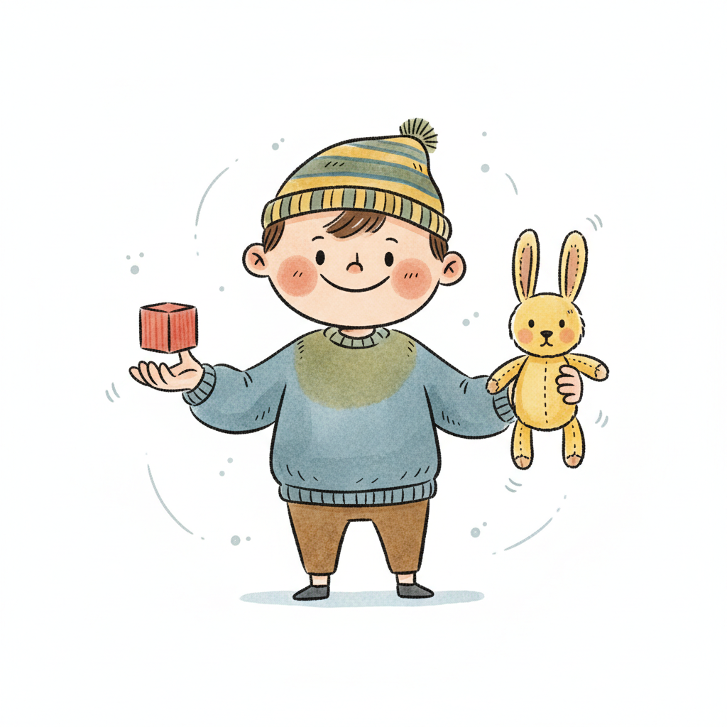 Lächelnder Cartoon-Junge mit Mütze, hält einen roten Block und ein gelbes Hasen-Stofftier.