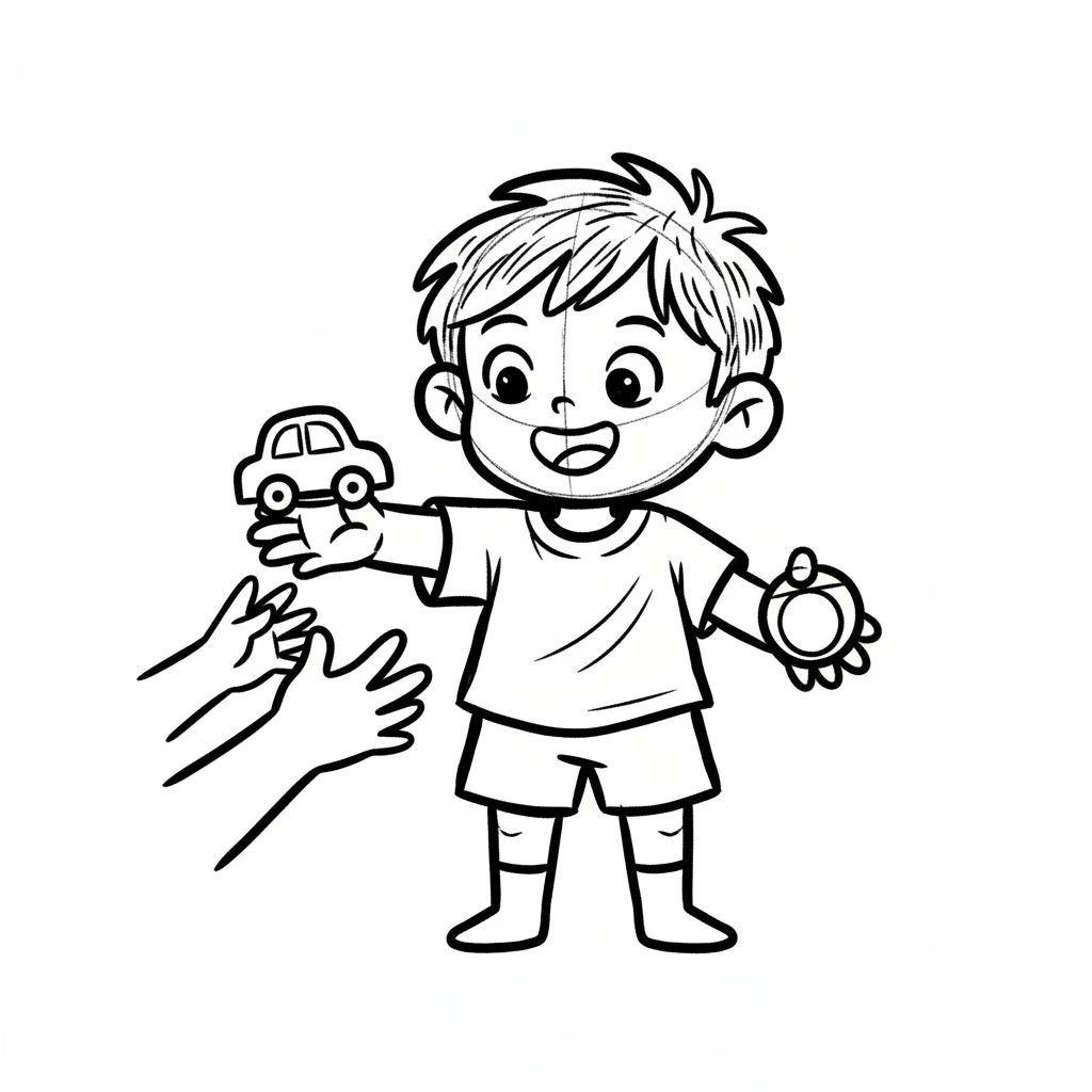 Glücklicher Junge hält Spielzeugauto und Ball, Hände greifen danach. Schwarz-Weiß-Zeichnung.