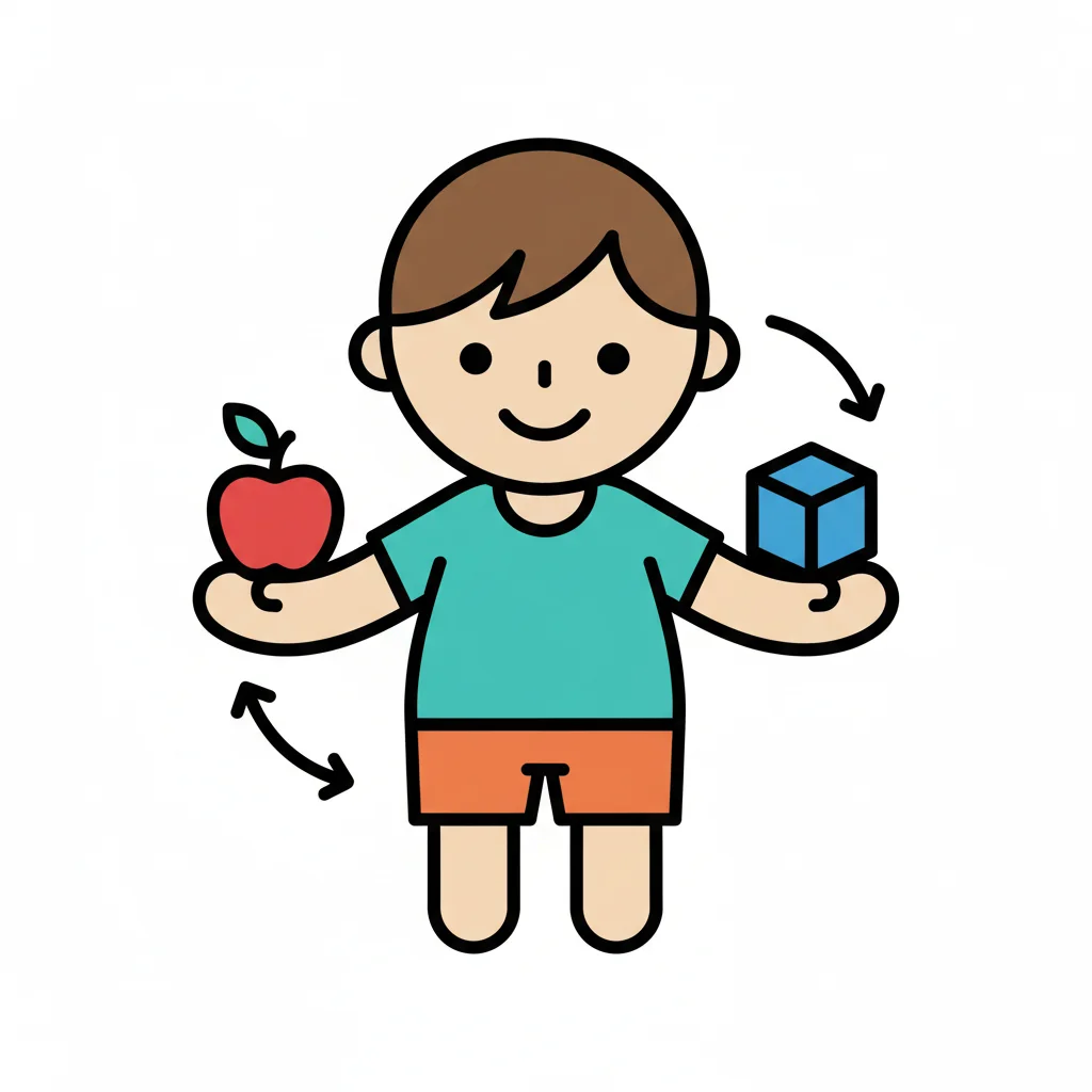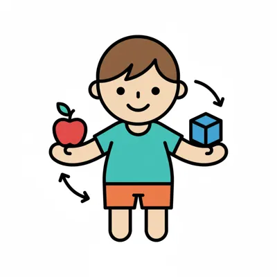 Ein lächelnder Junge hält einen Apfel und einen Würfel, Pfeile symbolisieren Wahl oder Vergleich.