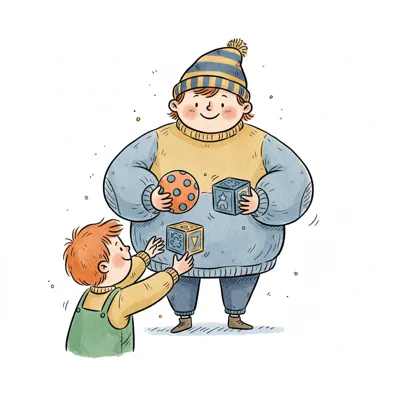 Niedliche, kindgerecht illustrierte Szene mit einem Kind oder einer Person als Hauptfigur, vor rein weißem Hintergrund, im frech-nordischen Aquarell-Skizzenstil. Klare, leicht wackelige Tuschekonturen, sichtbare Pinsel- und Strichtextur, dezente Schraffuren, weiche handgemalte Farbflächen in gedeckten Farben. Einfache, runde Formen. Keine harten Schatten, sondern sanfte, transparente Aquarellschichten. Leicht raue, handgezeichnete Linien statt glatter Vektorkanten. Subtile, vereinzelte Kritzelpunkte oder kleine Details im Hintergrund (wie Pünktchen oder feine Striche), aber keine echte Umgebung oder Landschaft. Die Figur ist mittig zentriert. Insgesamt charmant, humorvoll, warm und handgemacht wirkend. WICHTIG: Das Bild darf ABSOLUT KEINEN TEXT, KEINE BUCHSTABEN und KEINE ZAHLEN enthalten.