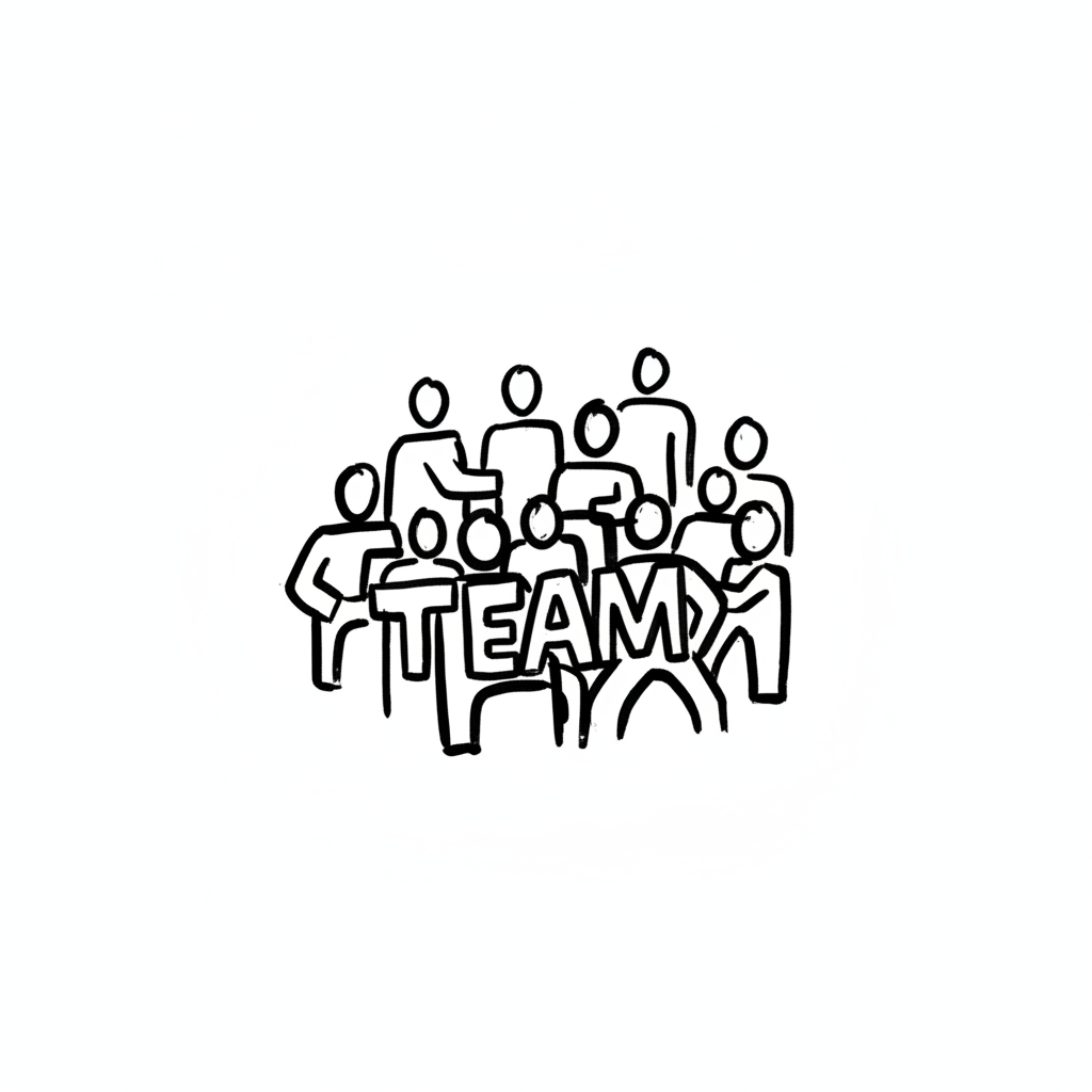 Strichzeichnung einer Gruppe von Menschen, die das Wort "TEAM" bilden und zusammenarbeiten.