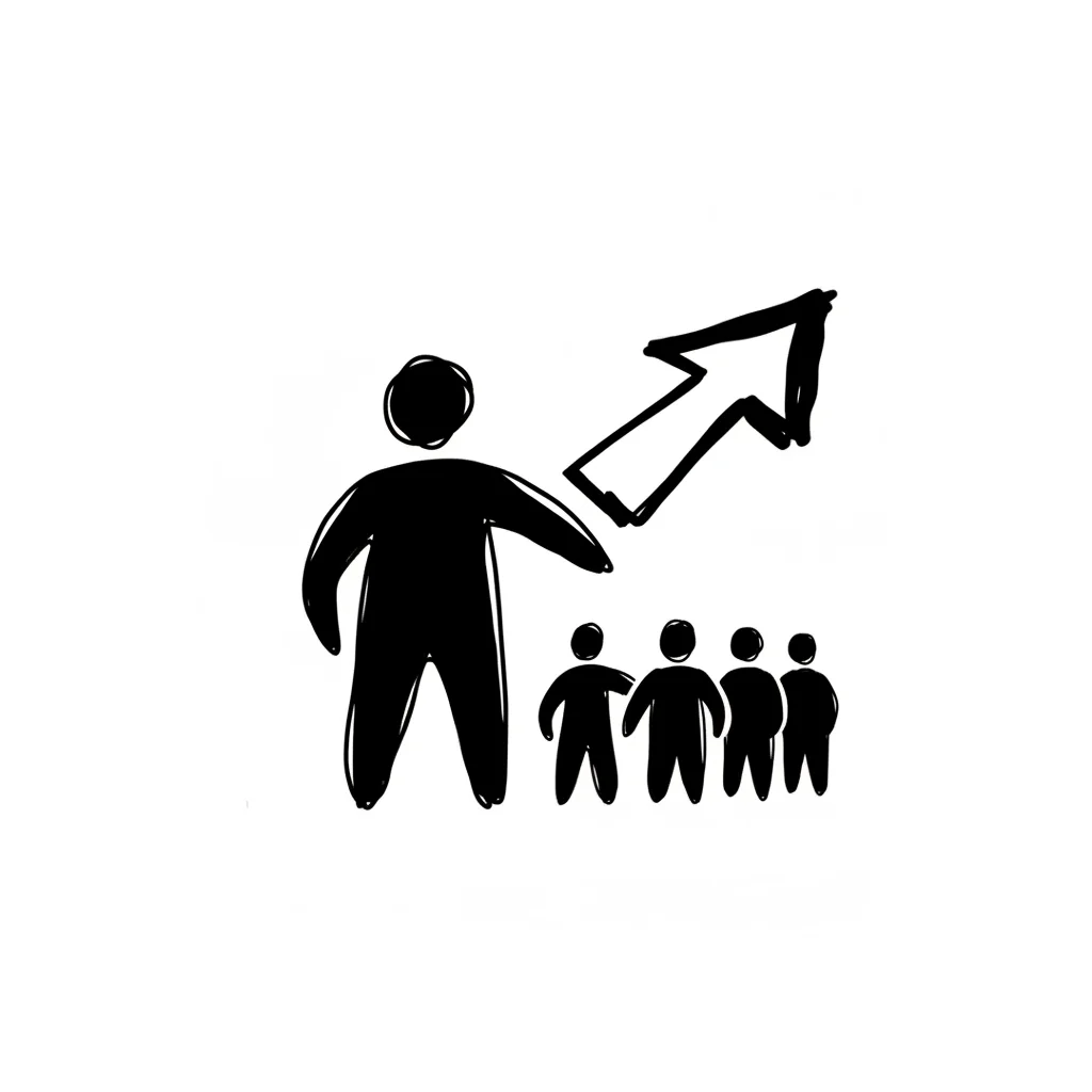 Führungsperson leitet Team mit Pfeil nach oben, symbolisiert Wachstum und Fortschritt.
