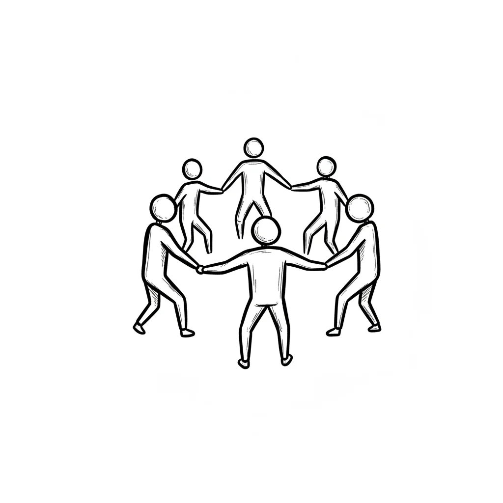 Handgezeichnete Figuren halten Hände im Kreis, symbolisieren Gemeinschaft und Zusammenhalt.