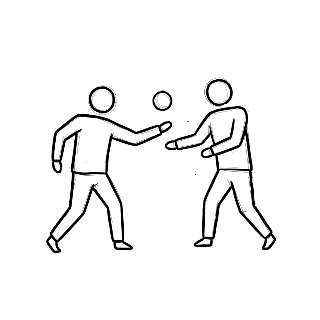Zwei Strichmännchen spielen Ball, einer wirft, der andere fängt.