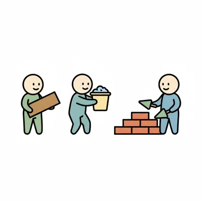 Drei Strichmännchen bauen eine Ziegelmauer: einer trägt Ziegel, einer Mörtel, einer mauert.
