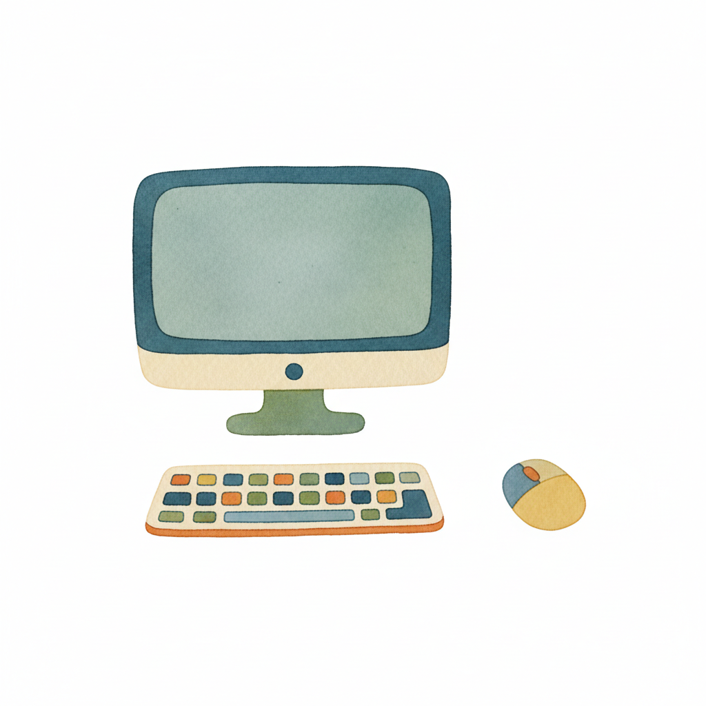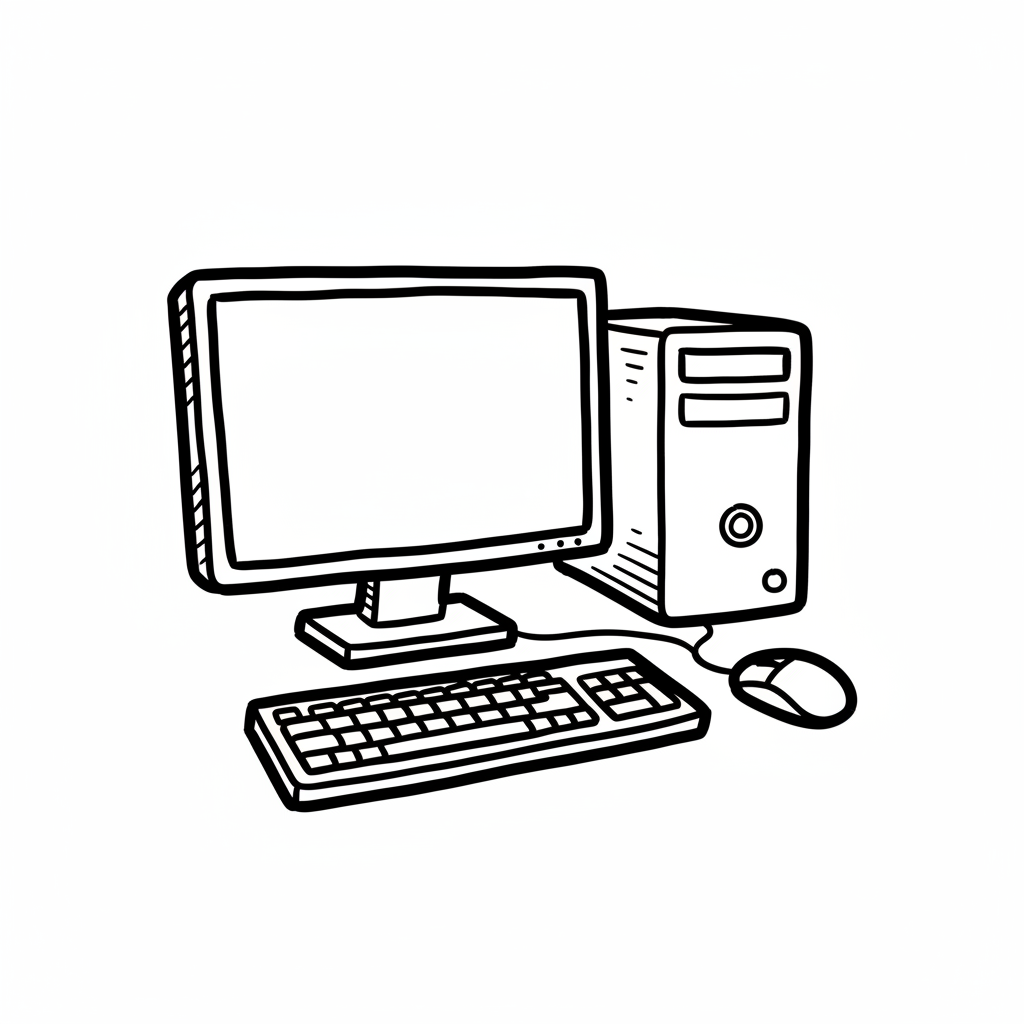 Ein Computer mit Monitor, Tastatur und Maus in einfacher Zeichnungsstil.