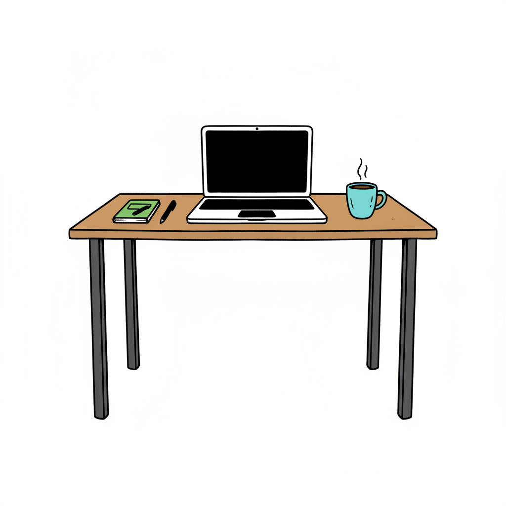 Ein Schreibtisch mit Laptop, Notizbuch und einer Tasse Kaffee.