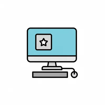 Ein stilisierter Computer mit Bildschirm, Tastatur und Maus.