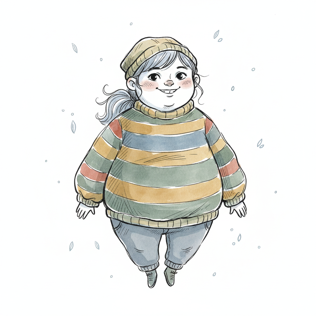 Niedliche Cartoon-Figur in gestreiftem Pullover und Mütze, lächelnd und schwebend.