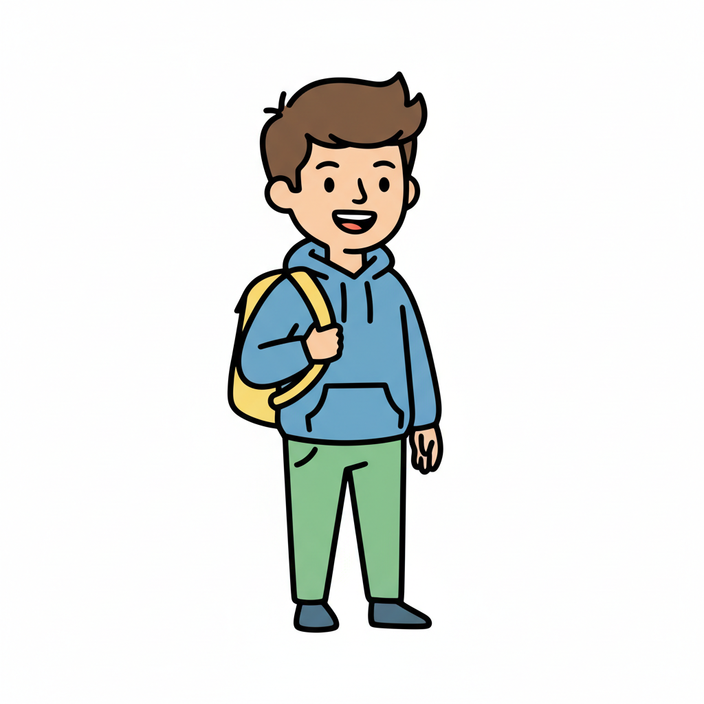 Lächelnder Cartoon-Junge mit braunen Haaren, blauem Hoodie, grüner Hose und gelbem Rucksack.