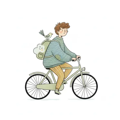 Cartoon-Junge fährt Fahrrad mit Wolkenrucksack und Vogel auf weißem Hintergrund.