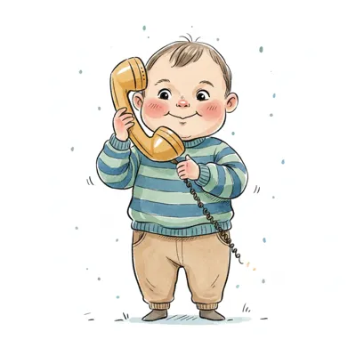 Ein lächelnder Junge spricht mit einem alten Telefon.