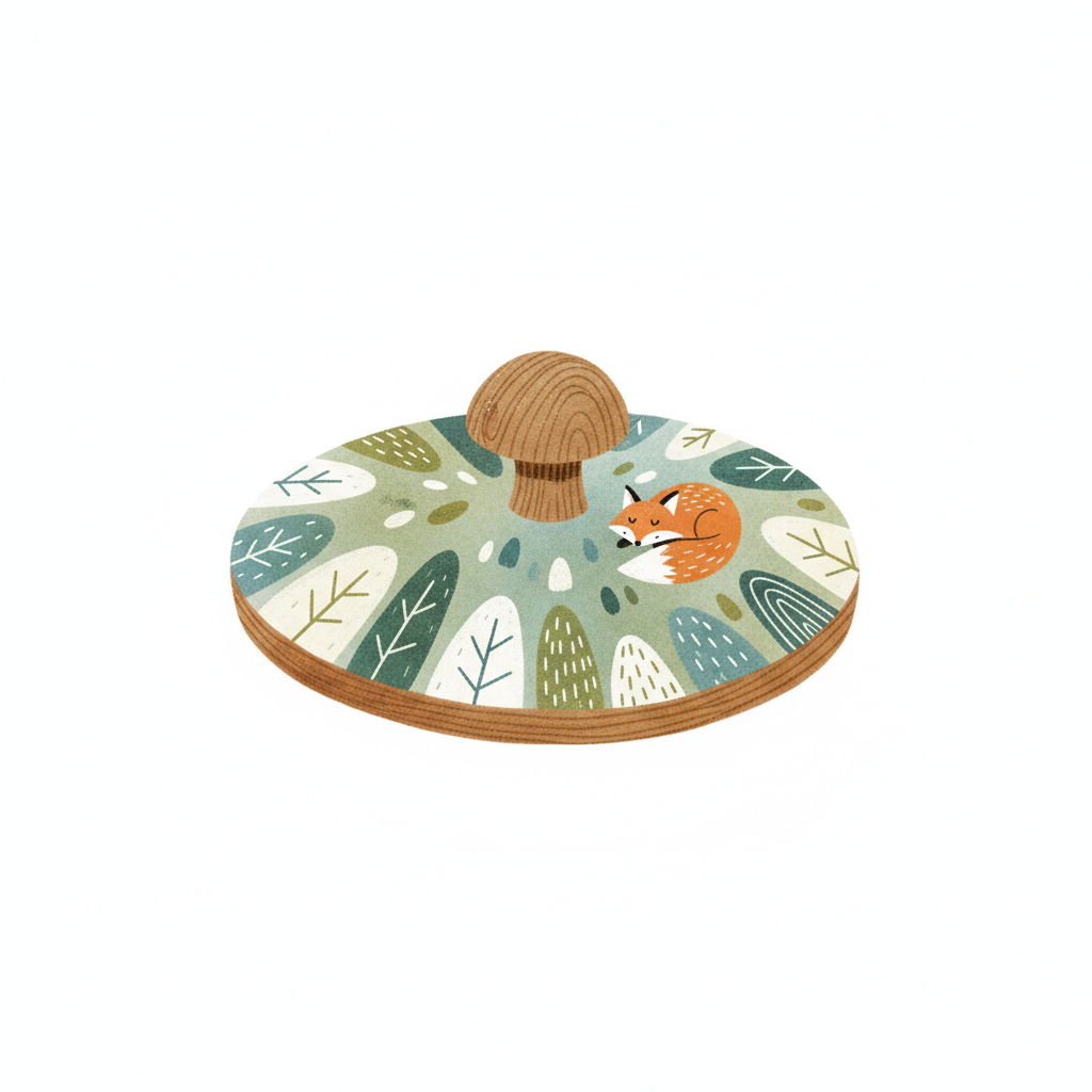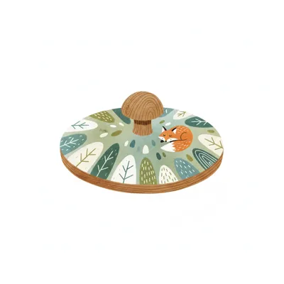 Ein dekorativer Holzteller mit einem Fuchs und Pflanzenmuster.