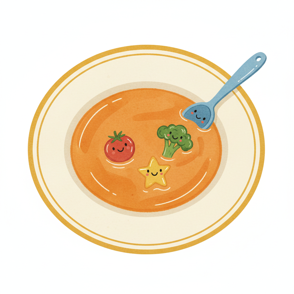 Bunte Suppe mit lächelnden Gemüsefiguren auf einem Teller.