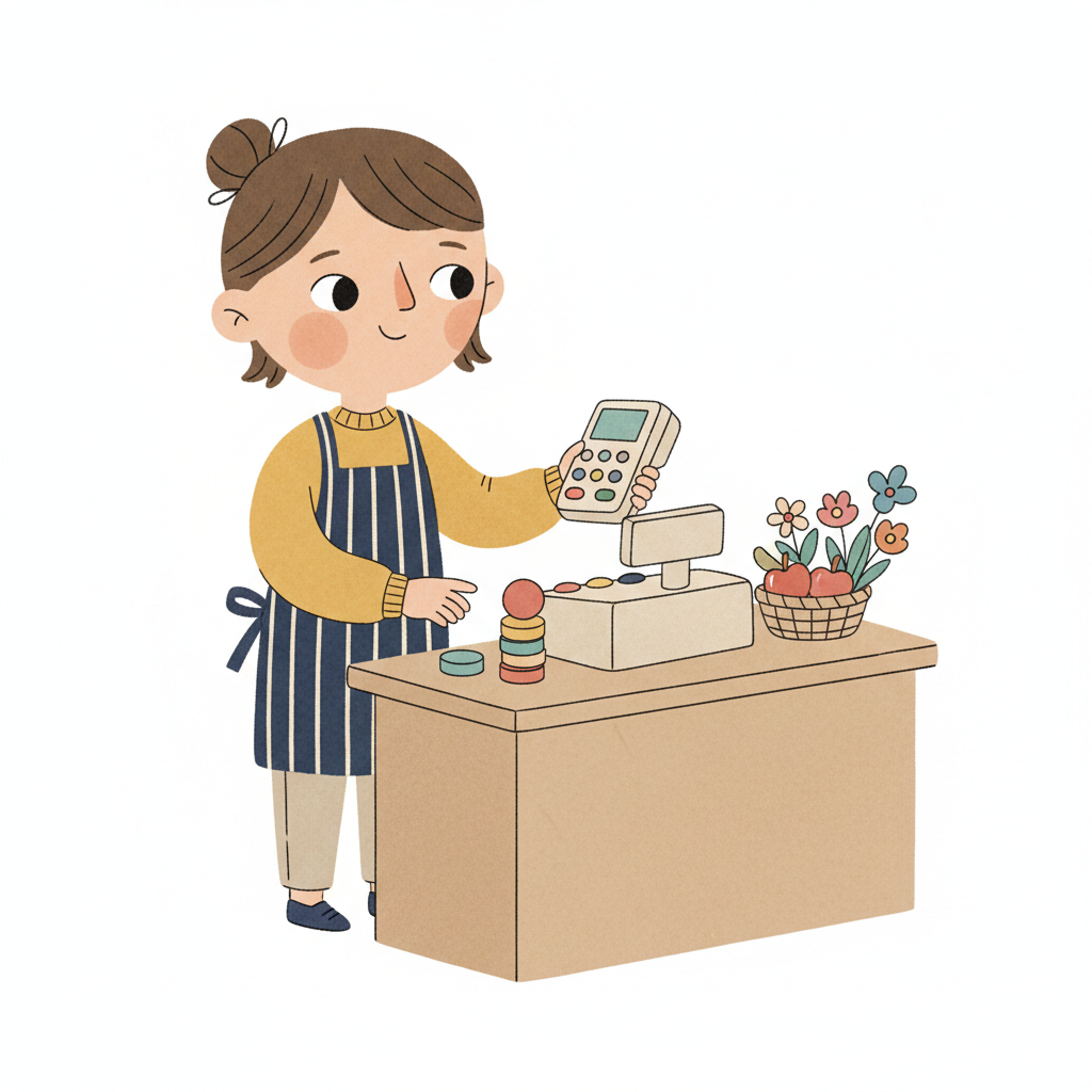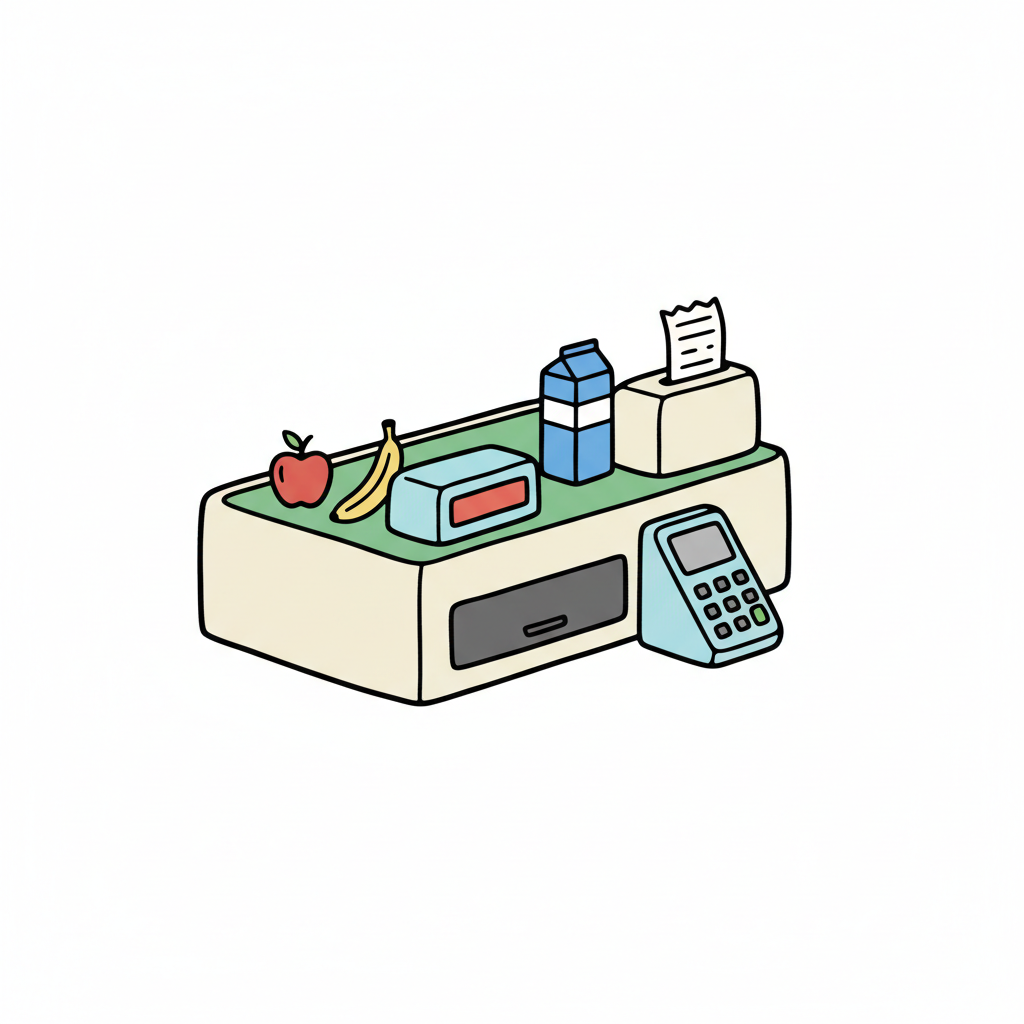 Supermarktkasse mit Apfel, Banane, Milch, Kassenbon und Bezahlterminal in einfacher Comic-Optik.