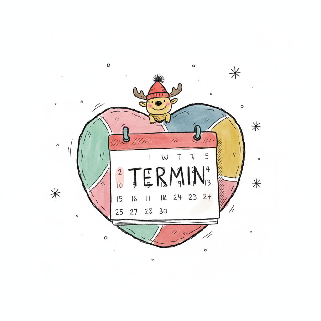 Niedliches Rentier auf einem Kalenderblatt mit "TERMIN" vor einem bunten Herz und Schneeflocken.