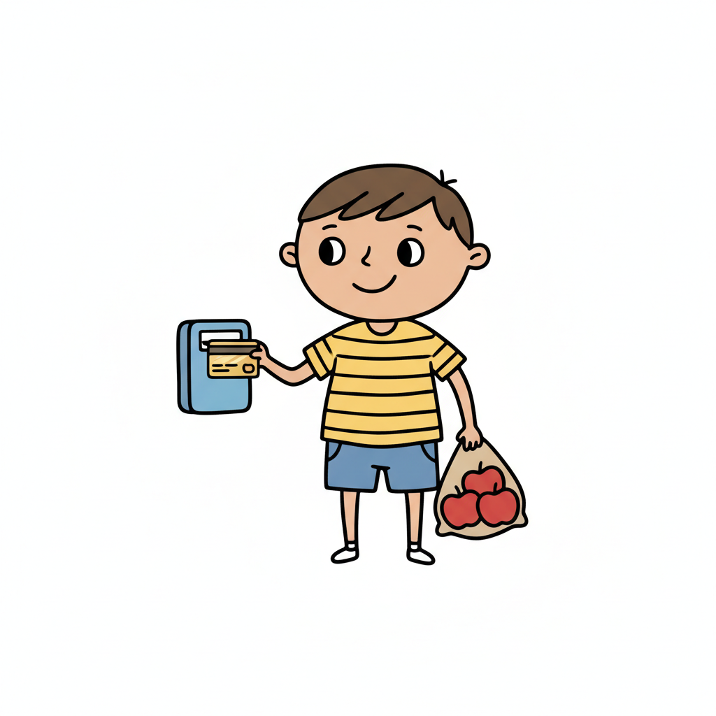 Ein Junge bezahlt mit Karte am Terminal und hält eine Tüte Äpfel.