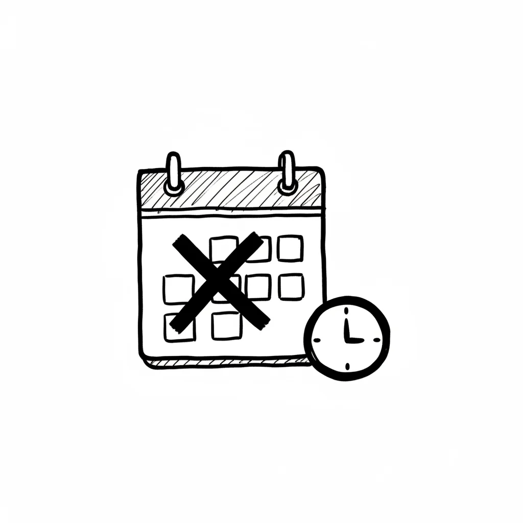 Handgezeichnetes Kalender-Symbol mit großem X und Uhr, symbolisiert abgesagten Termin oder Zeit.