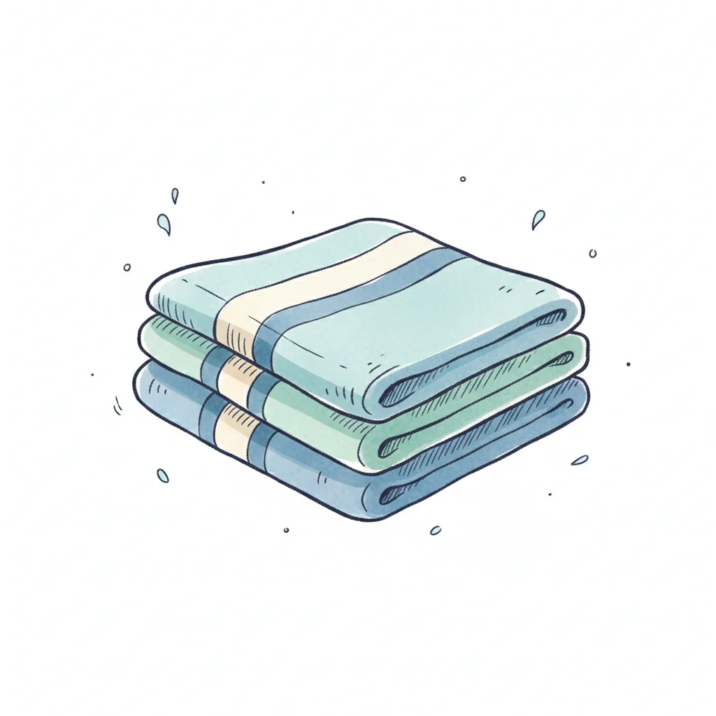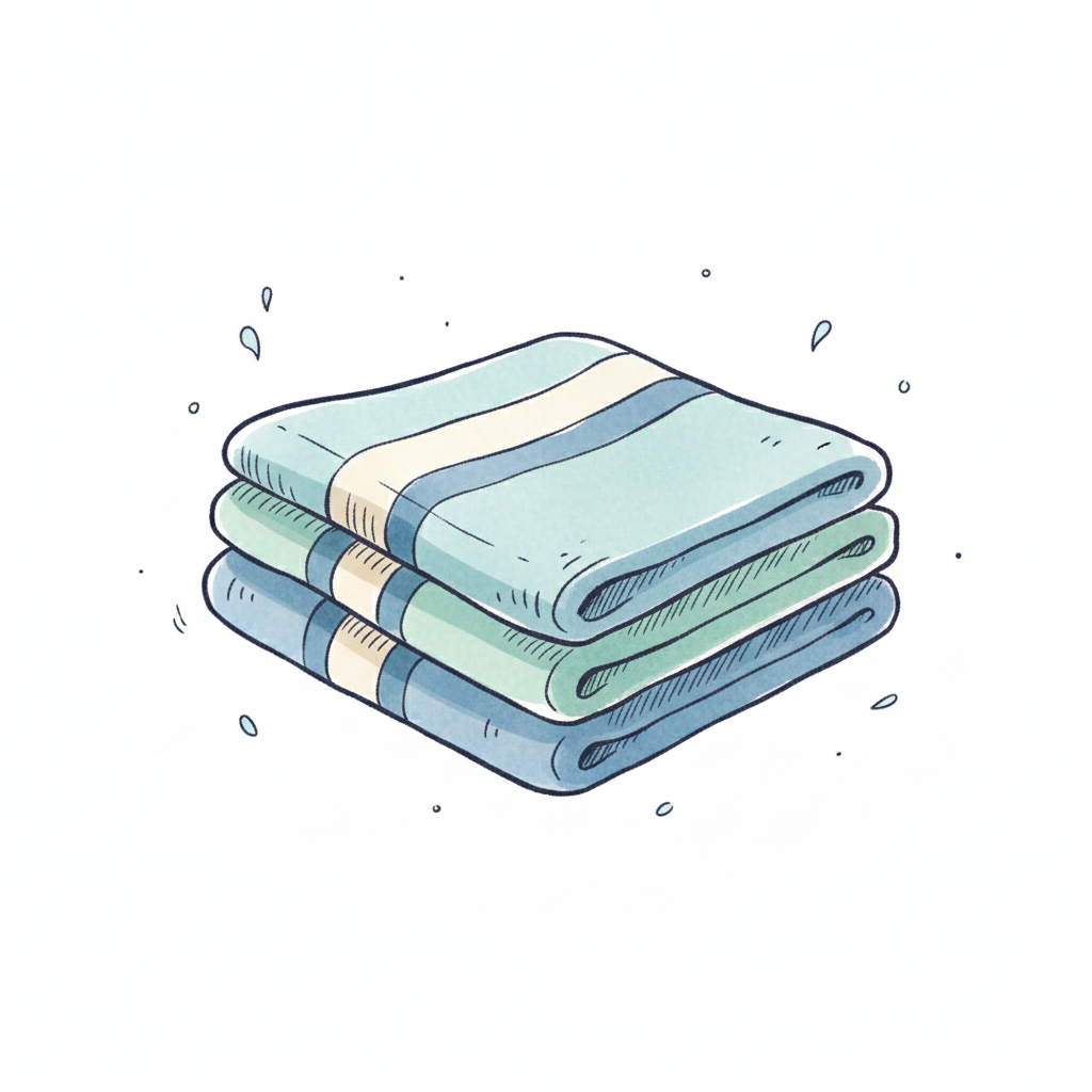 Drei übereinanderliegende Handtücher in Blau- und Grüntönen.