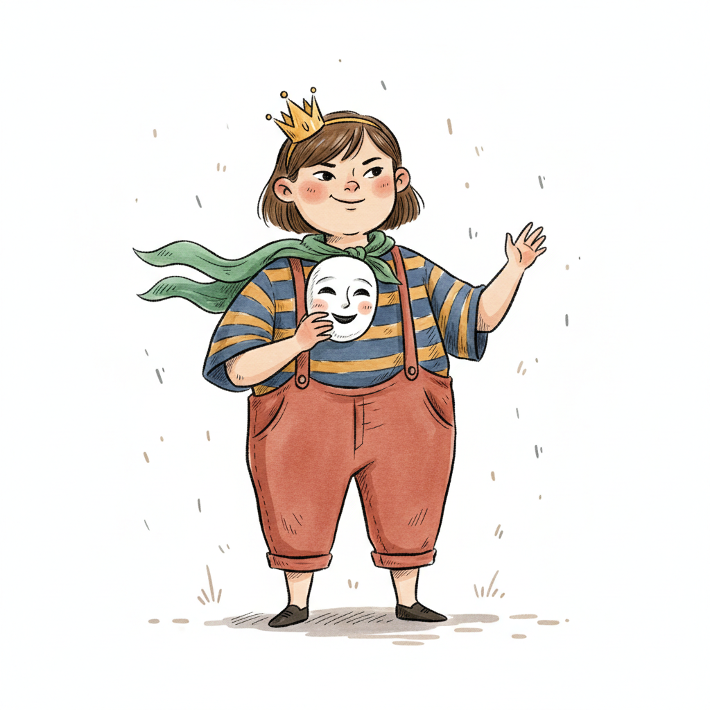 Junge mit Krone, Schwert und Maske, steht vor einem Vorhang.