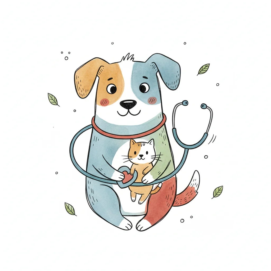 Ein hund mit einem stethoskop umarmt eine katze.