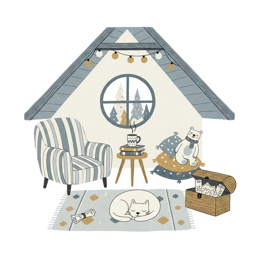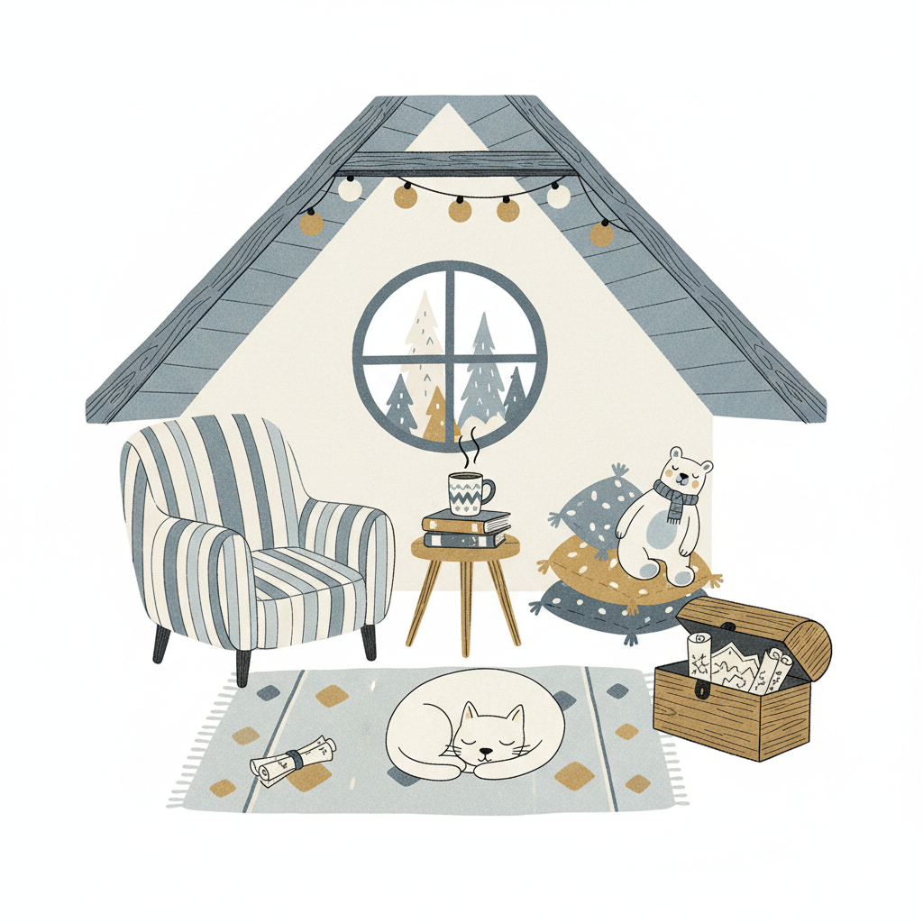 dachboden gemütlichkeit interieur haustiere nordic-bilderbuch-stil