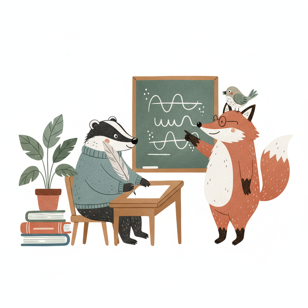 Ein Fuchs lehrt einen Dachs an einer Tafel, Vogel sitzt drauf.