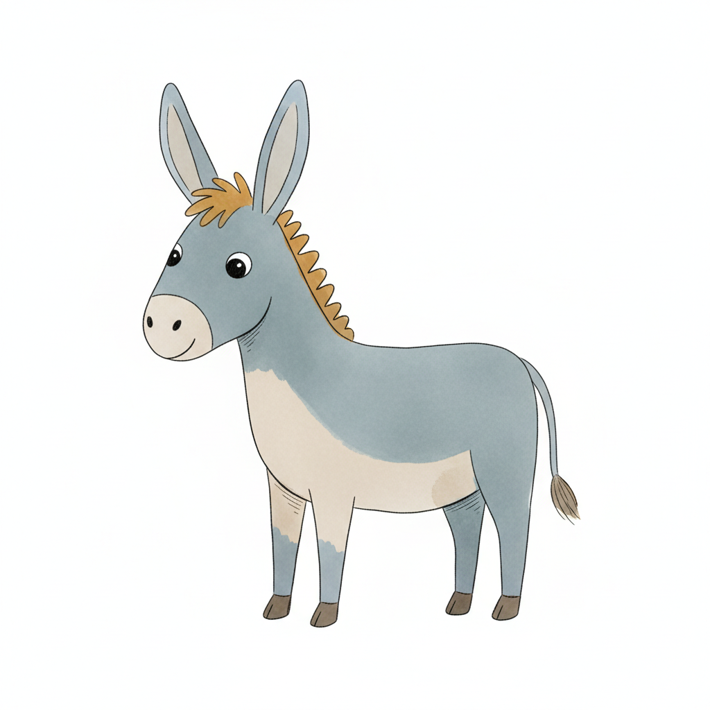 Ein niedlicher, cartoonartiger Esel mit braunen und blauen Farbtönen.