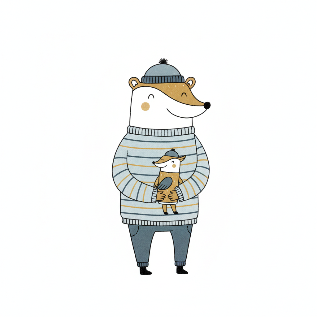 Ein Bär in einem Pullover hält einen kleinen Fuchs.