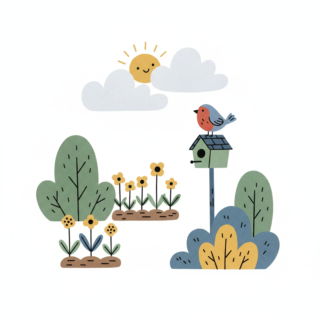 Fröhliche Landschaft mit Sonne, Wolken, Blumen und einem Vogelhaus.
