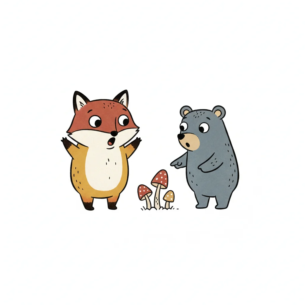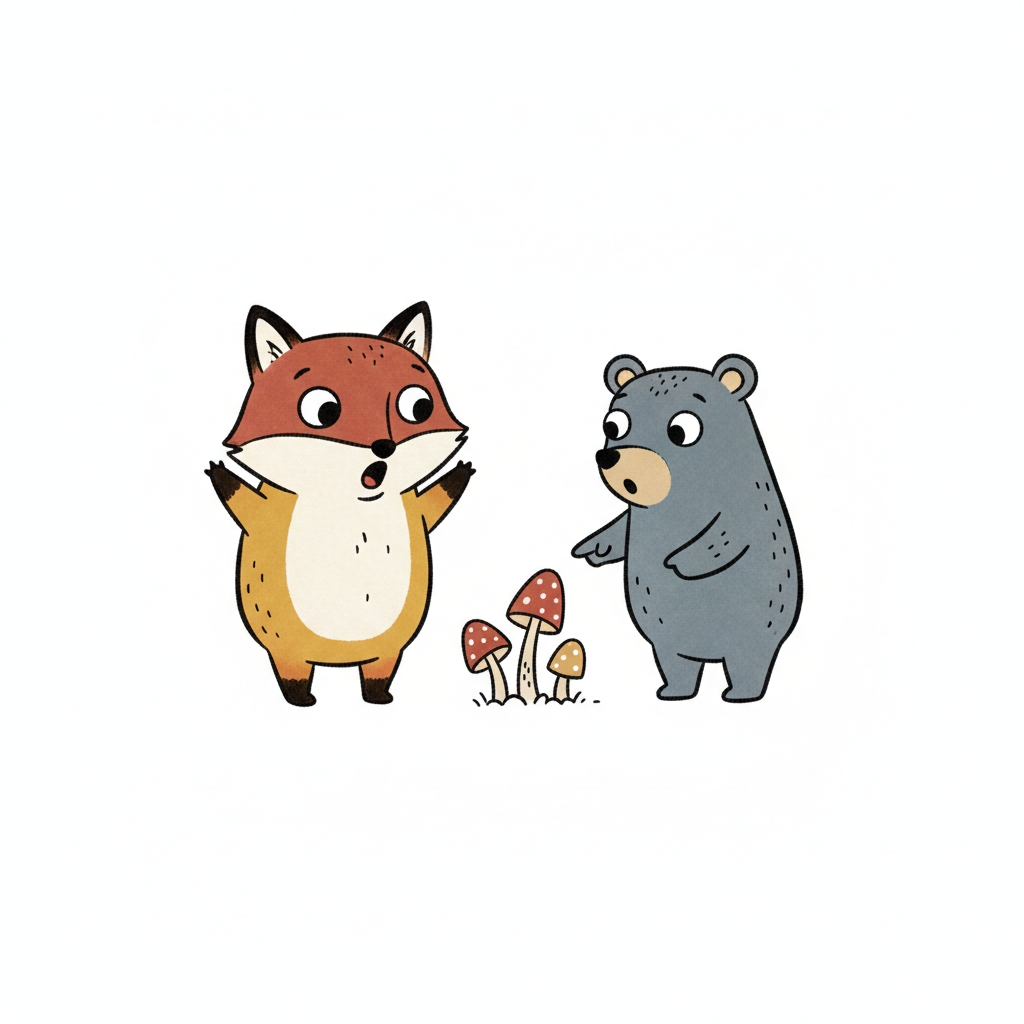 Ein Fuchs und ein Bär stehen überrascht vor Pilzen.