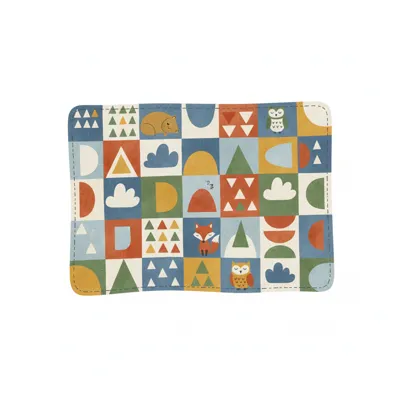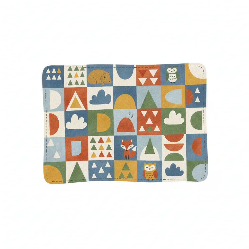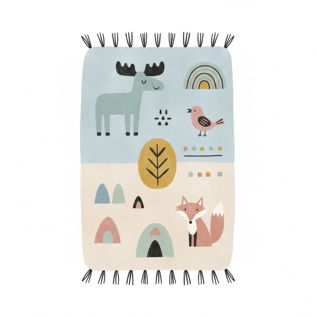 Bunte Decke mit Tieren und Naturmotiven in sanften Farben.